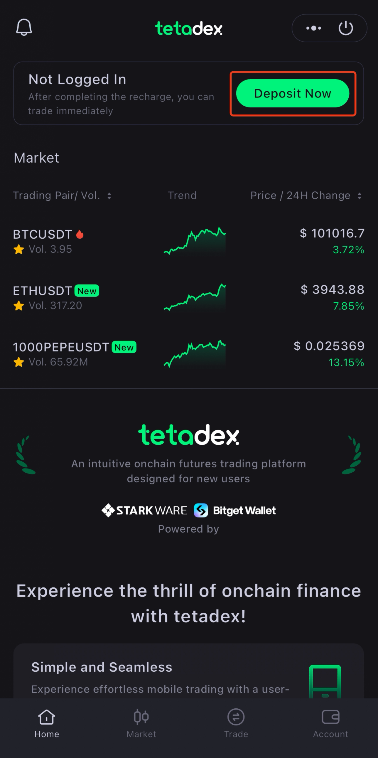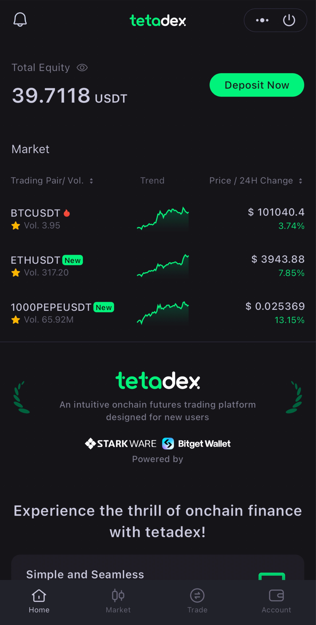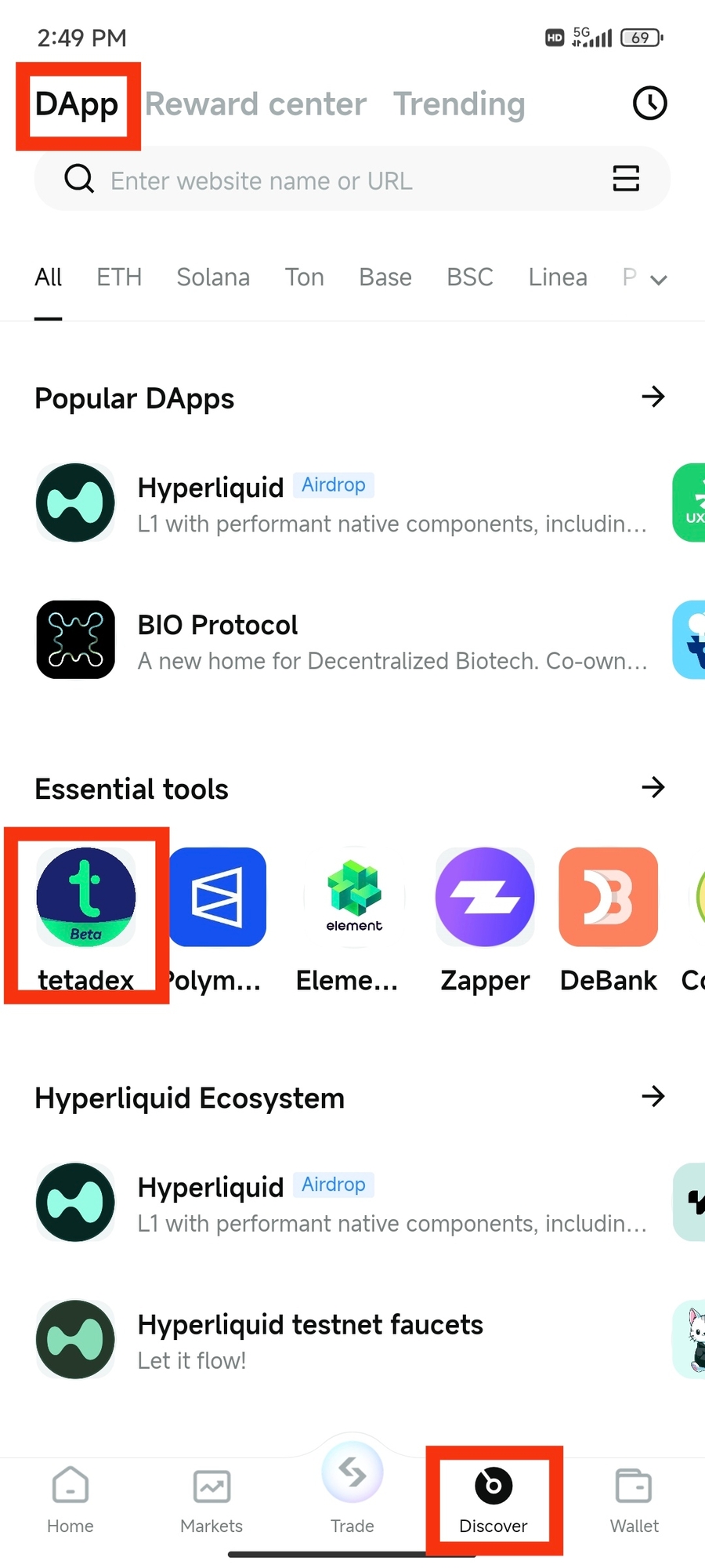 Once you're set up, search for "tatadex" in Discover > DApp, then tap on tatadex to launch the application.