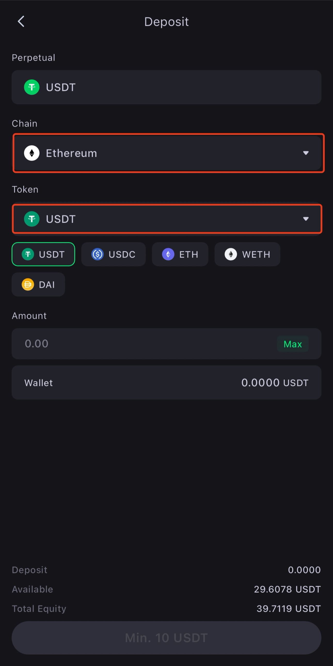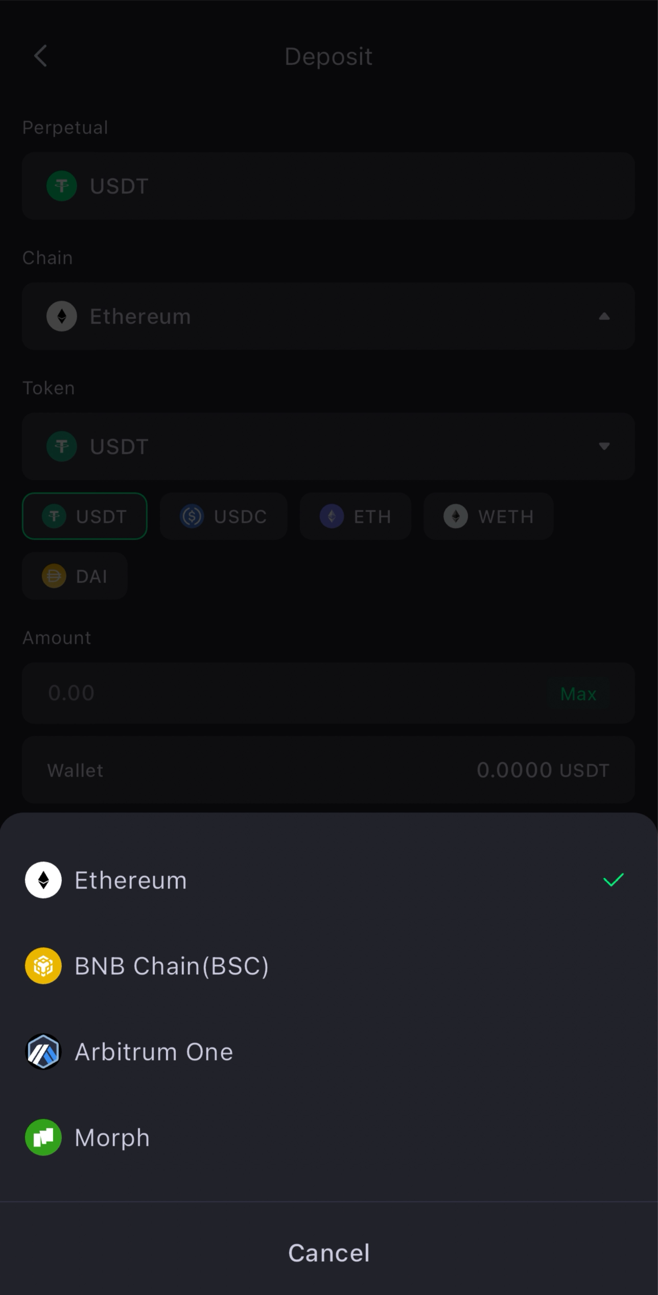 A deposit window will pop up, where you can select the chain and token you wish to deposit using the dropdown menus.