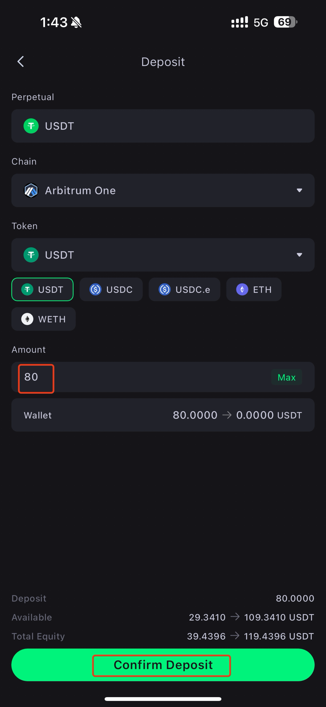 Enter the amount of tokens you want to deposit in the Amount field and tap Confirm Deposit.