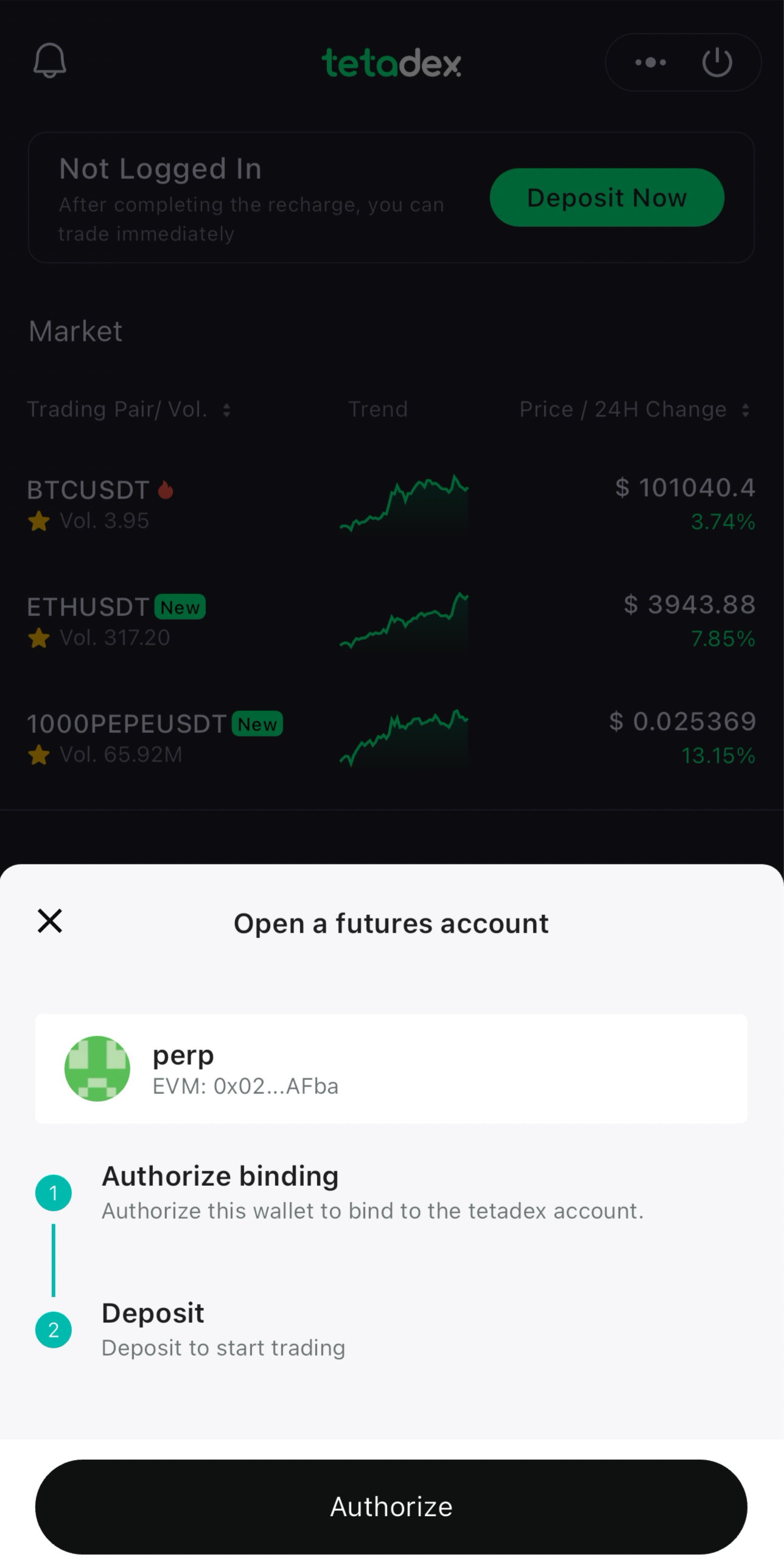 To deposit on tatadex, start by connecting your wallet on the tatadex homepage.